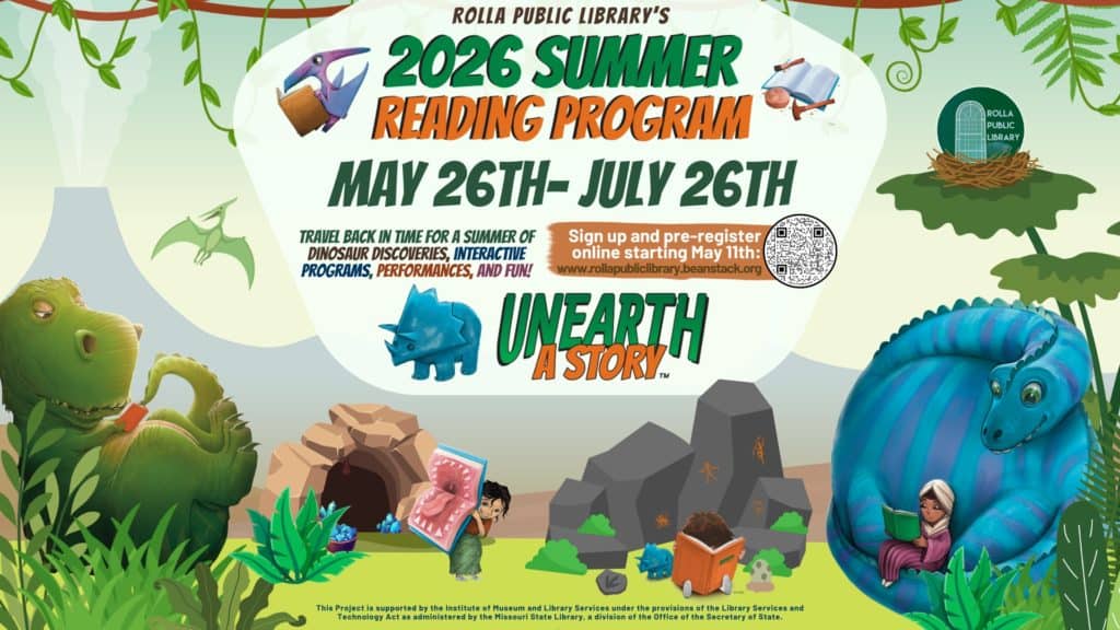 The 2026 Summer Reading Program theme is Dinosaurs and the slogan for all ages is “Unearth a Story”. The 2026 CSLP Program features artwork by Tom Bonson.